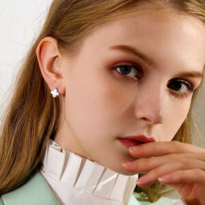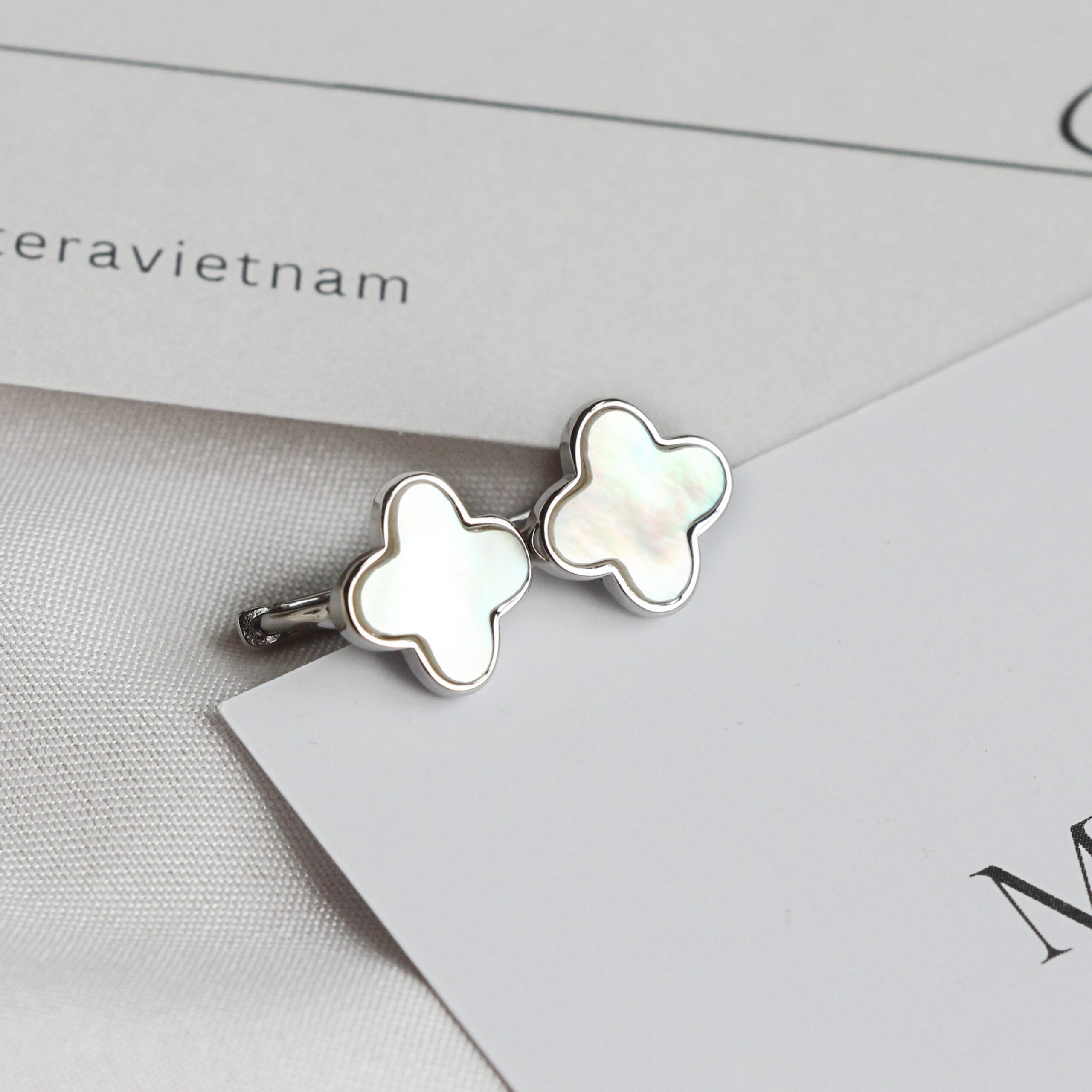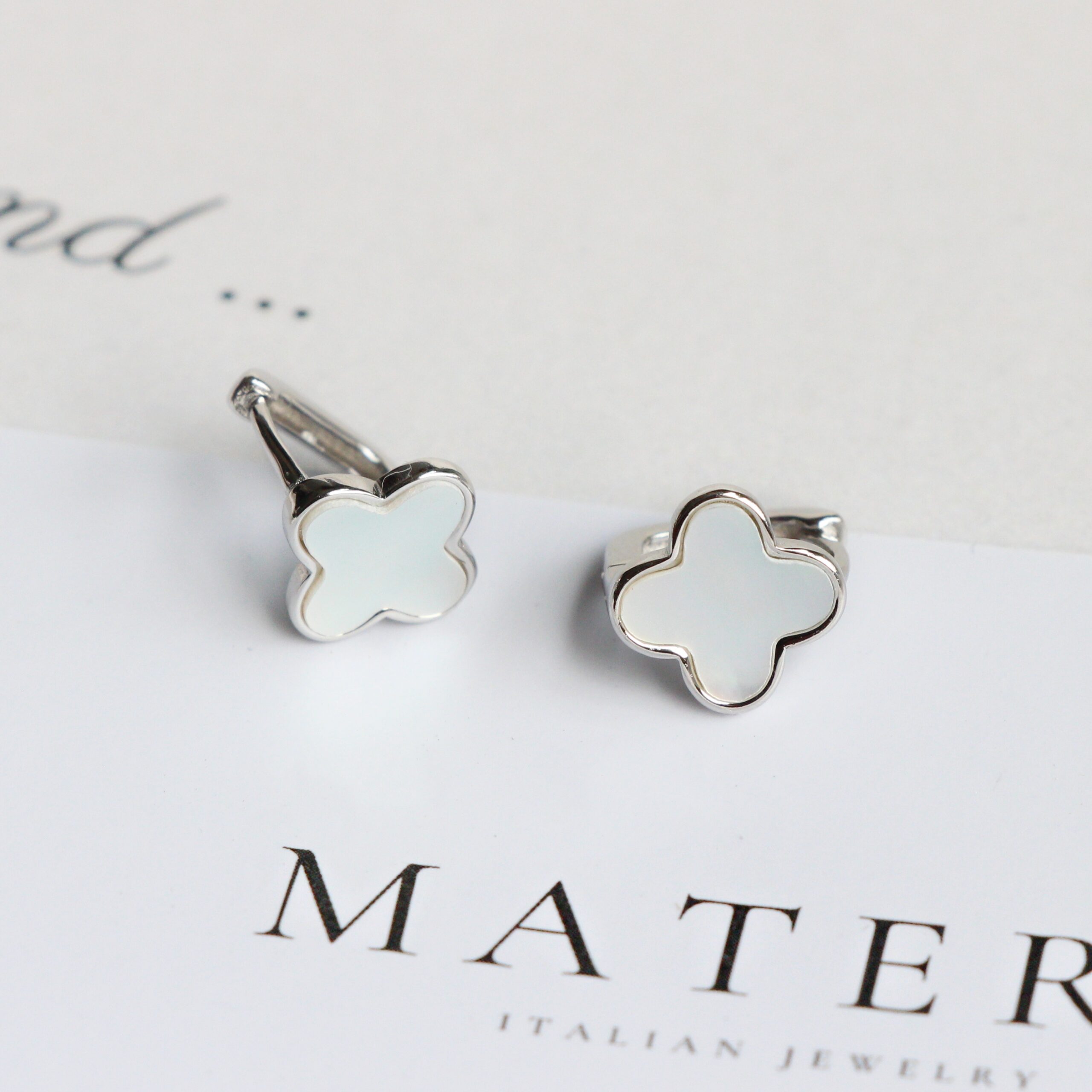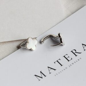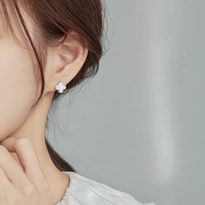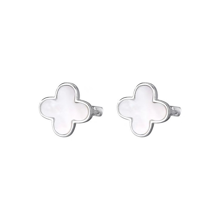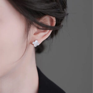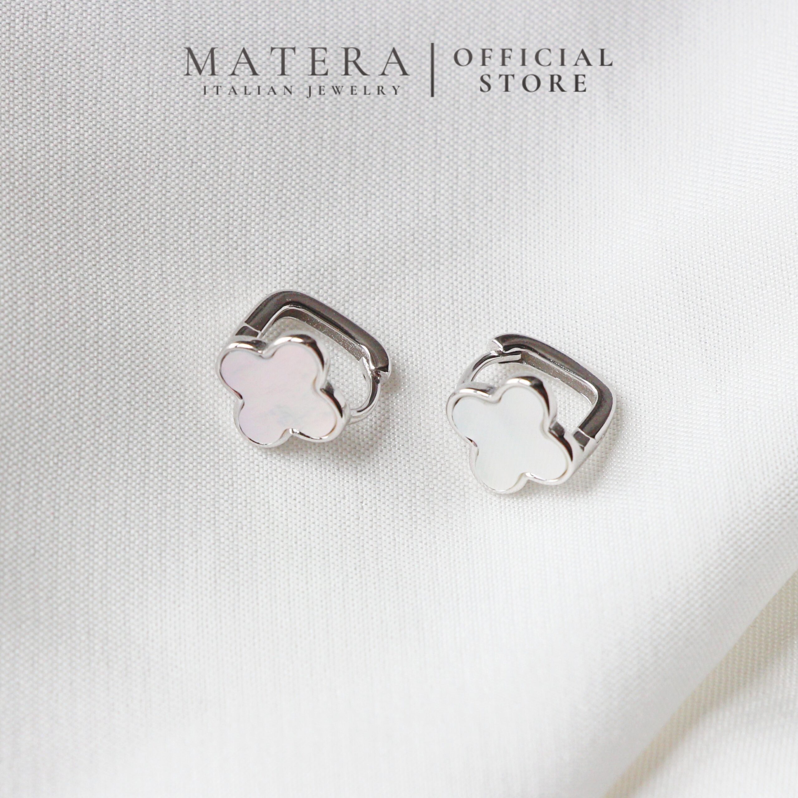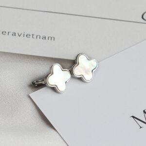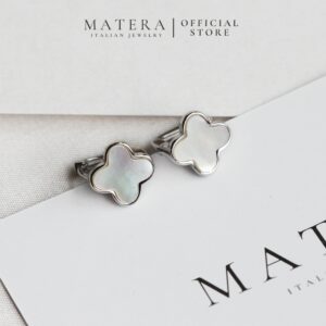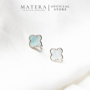 Bông tai bạc Lucky Florals Matera S999: Biểu tượng cỏ 4 lá may mắn. Chất liệu bạc S999 mạ bạch kim, khảm xà cừ lấp lánh, tôn vẻ đẹp thanh lịch.