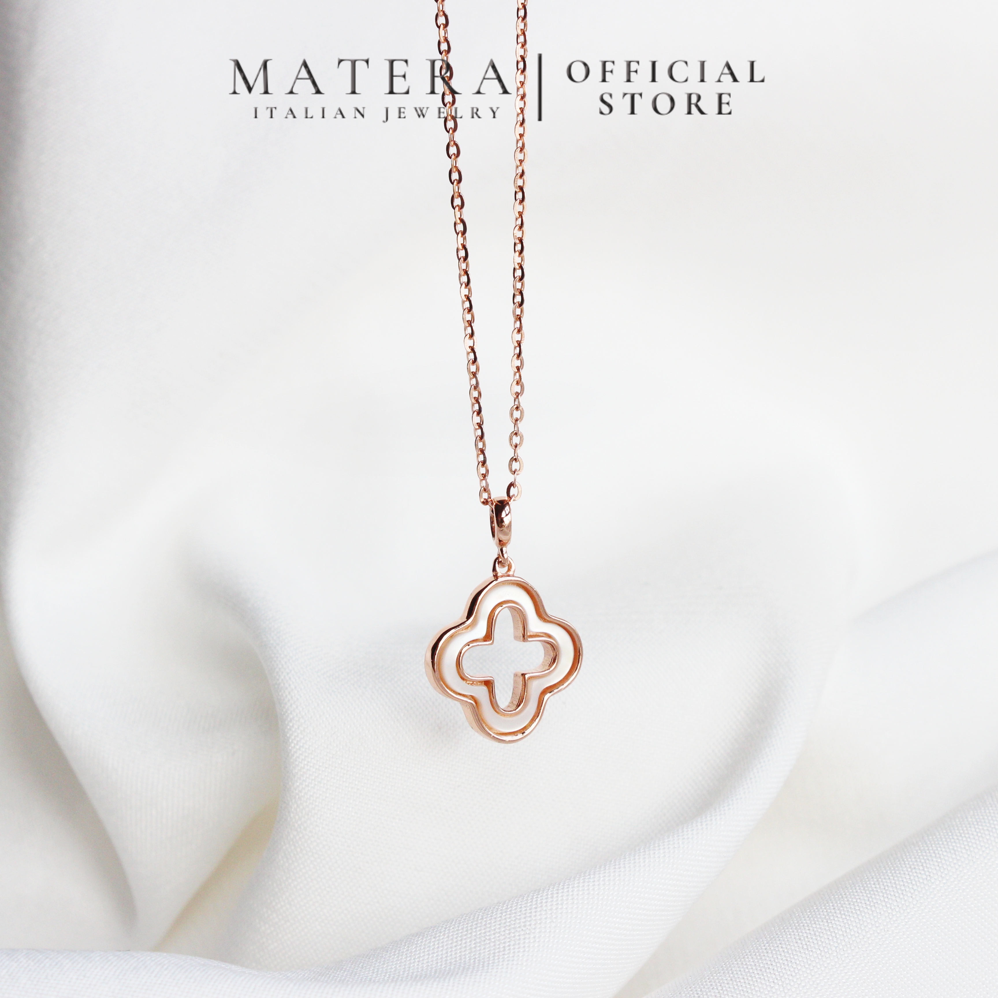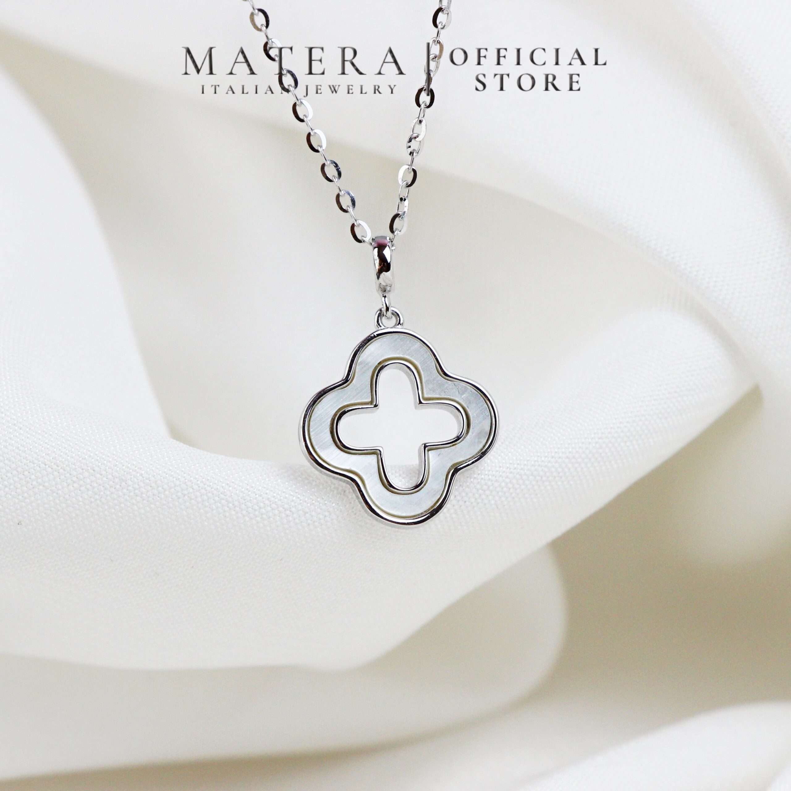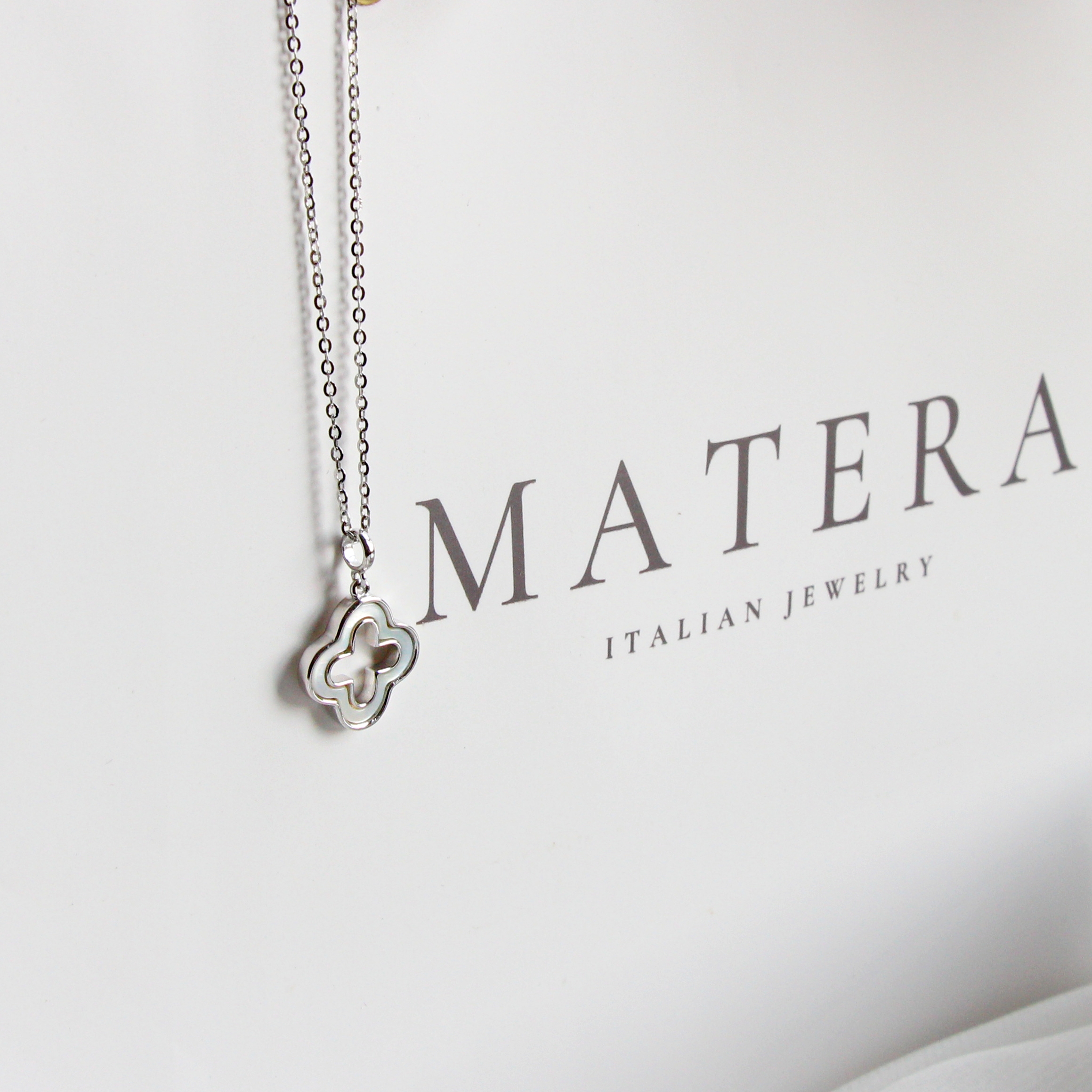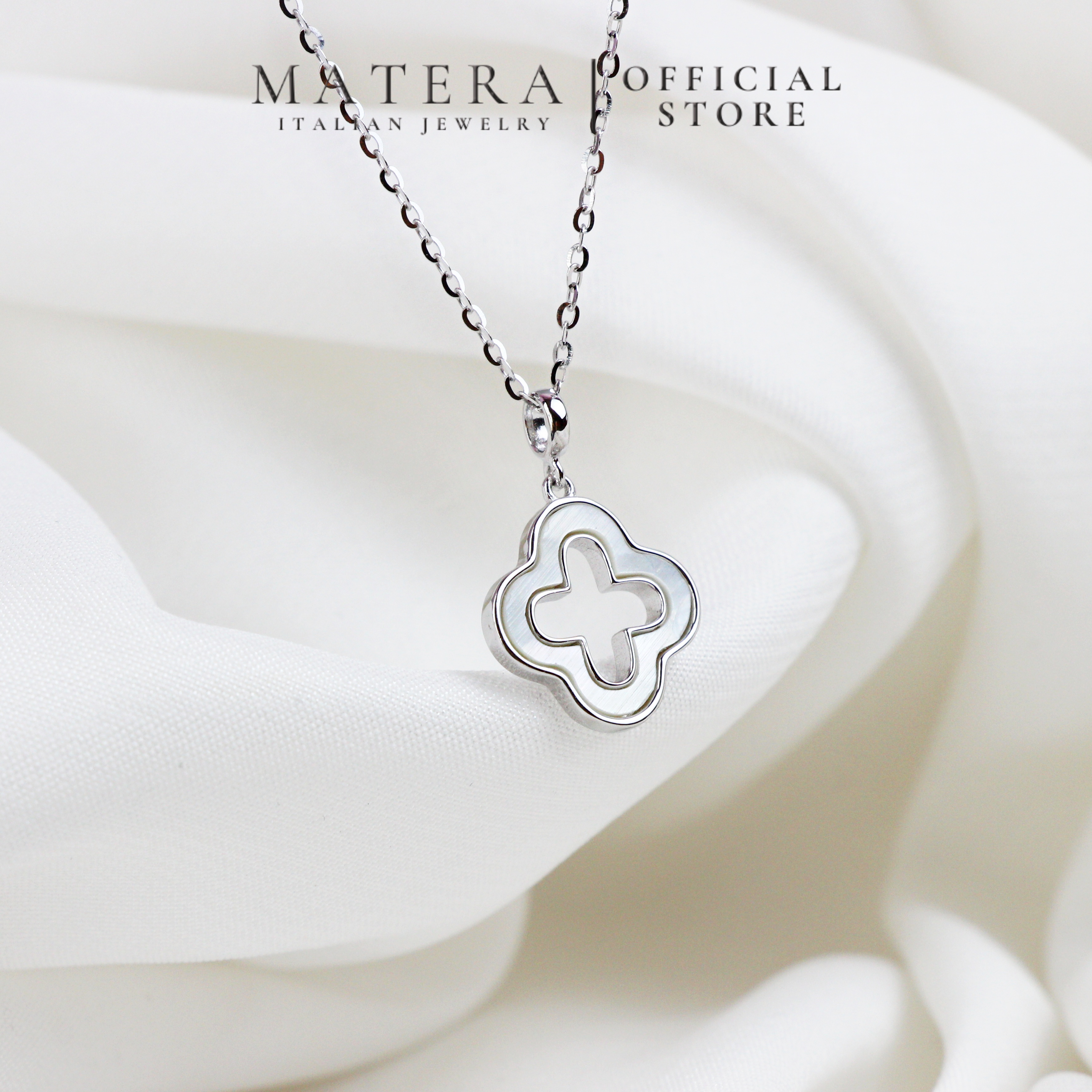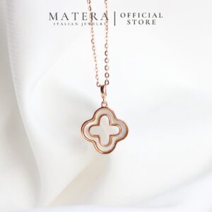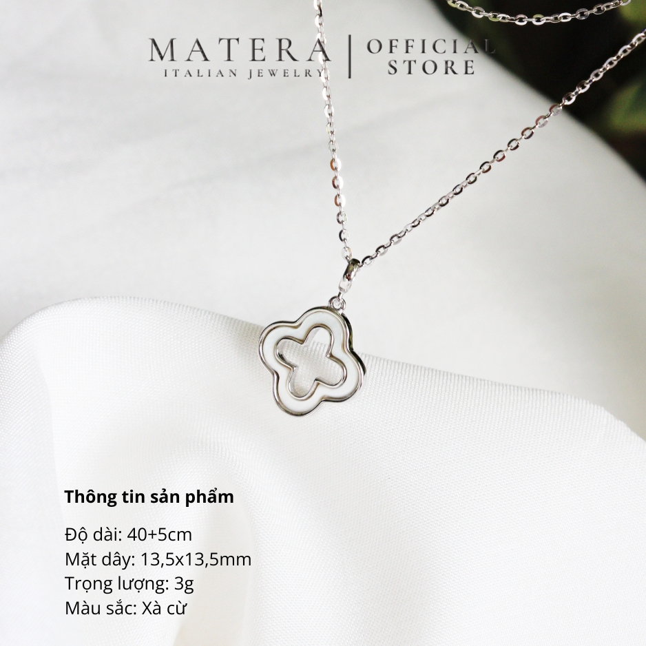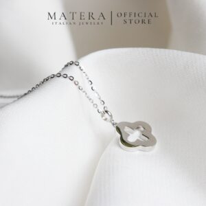 Dây chuyền mặt cỏ 4 lá rỗng Matera S925 bạc từ BST Xuân Hè 2024. Thiết kế tối giản, tinh tế với hoa bạc khảm xà cừ, bạc S925 mạ bạch kim. Tôn lên vẻ đẹp thanh lịch của nàng.