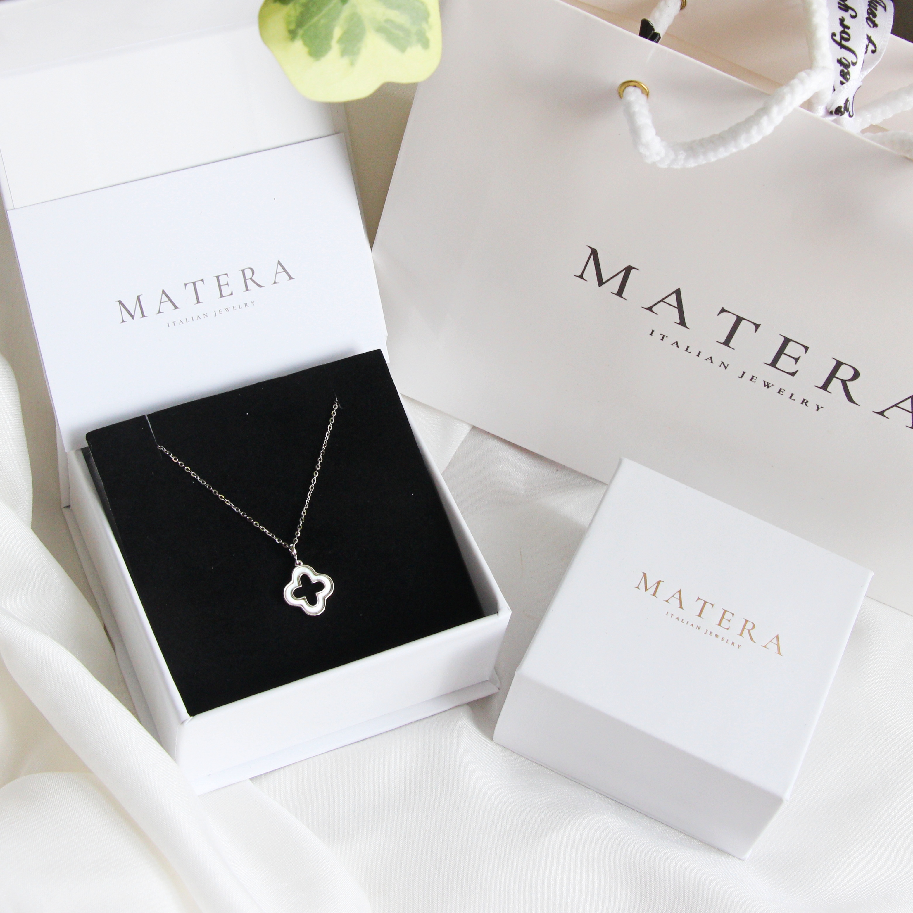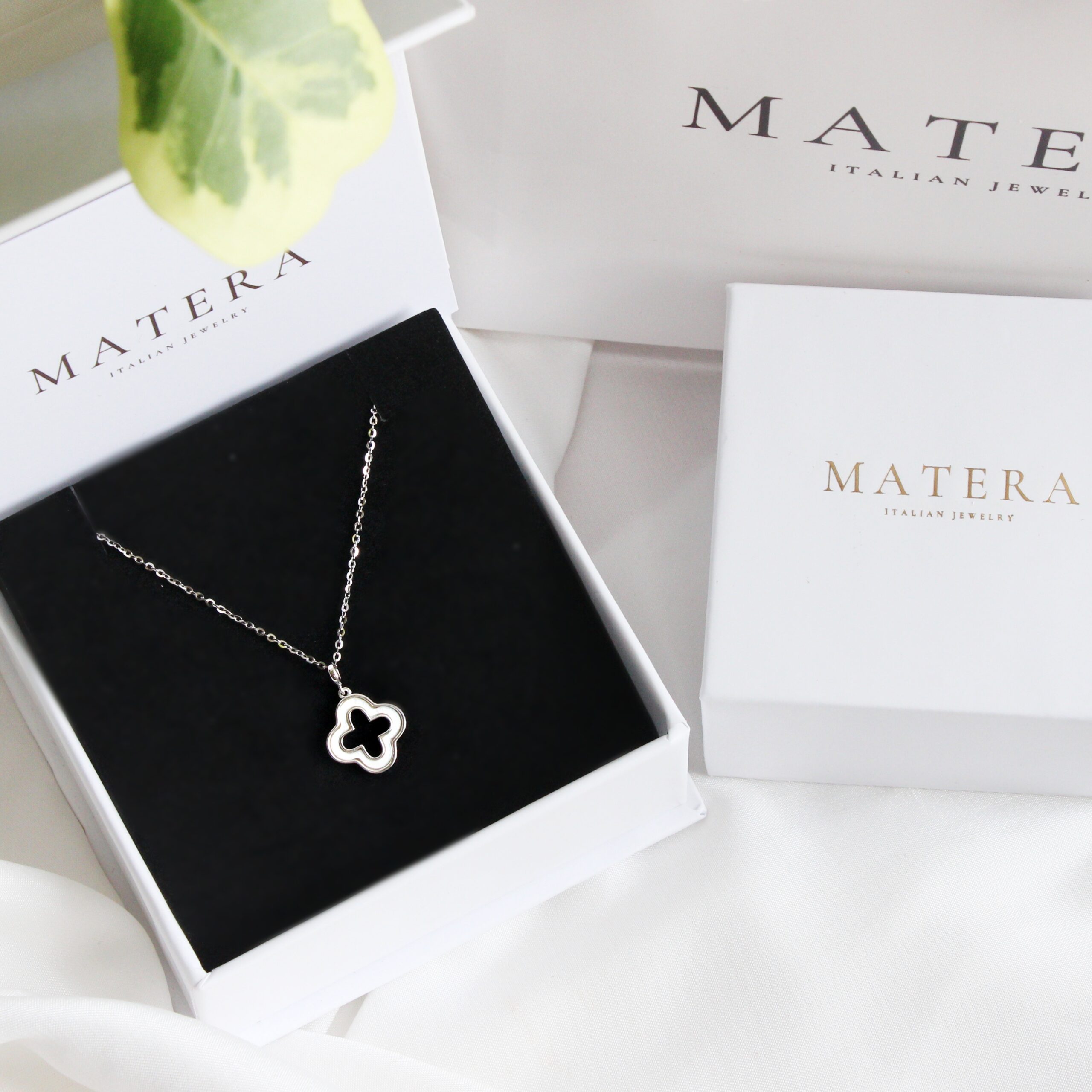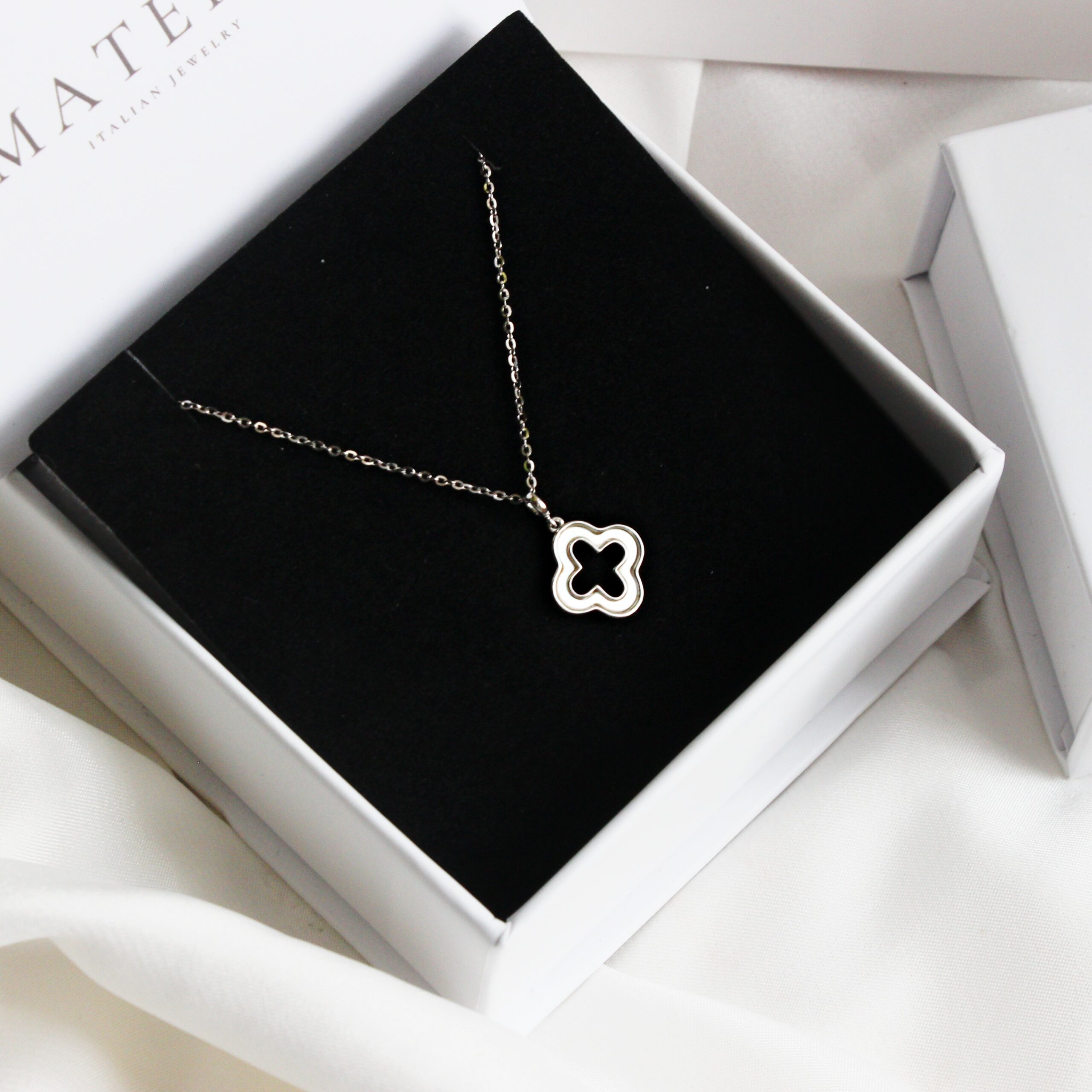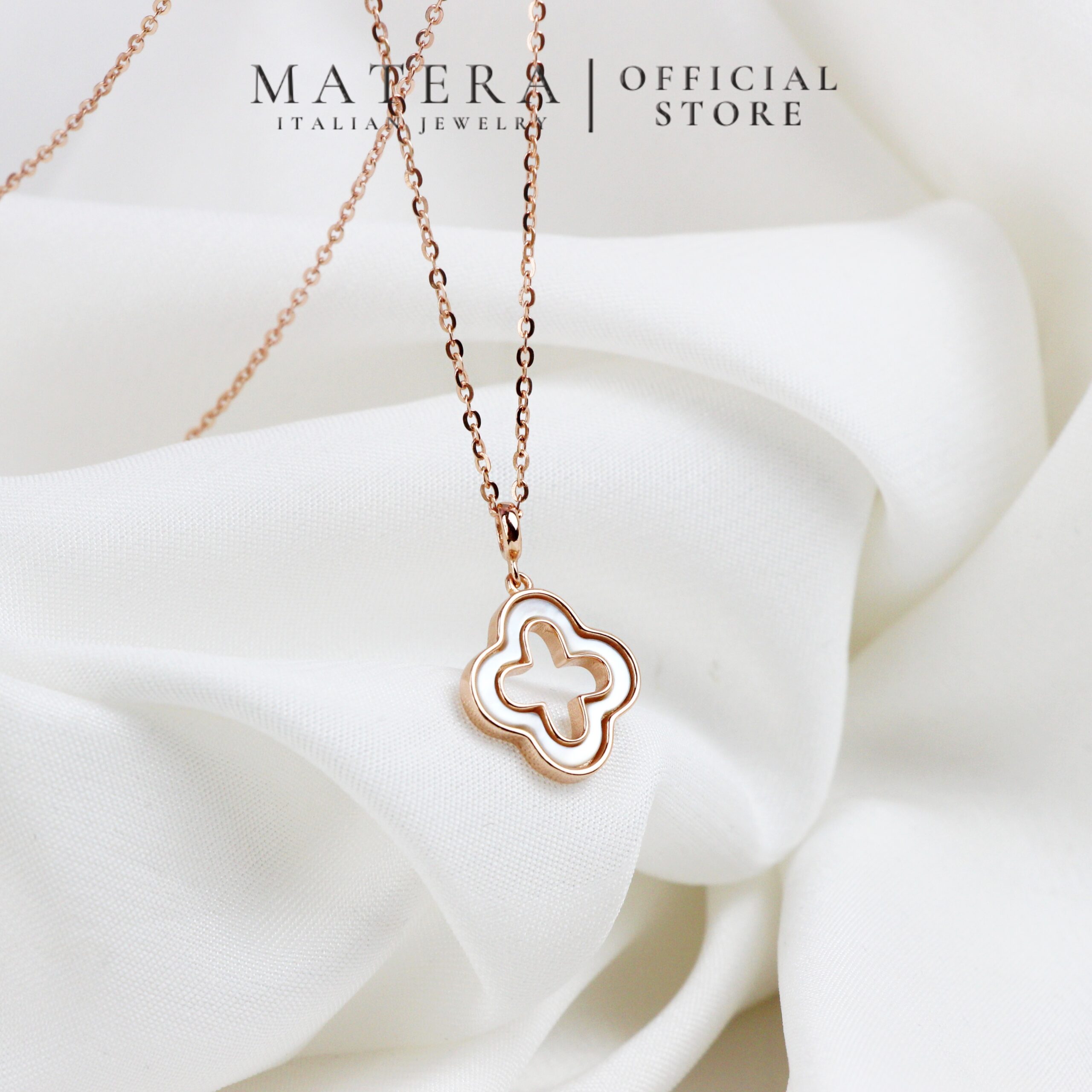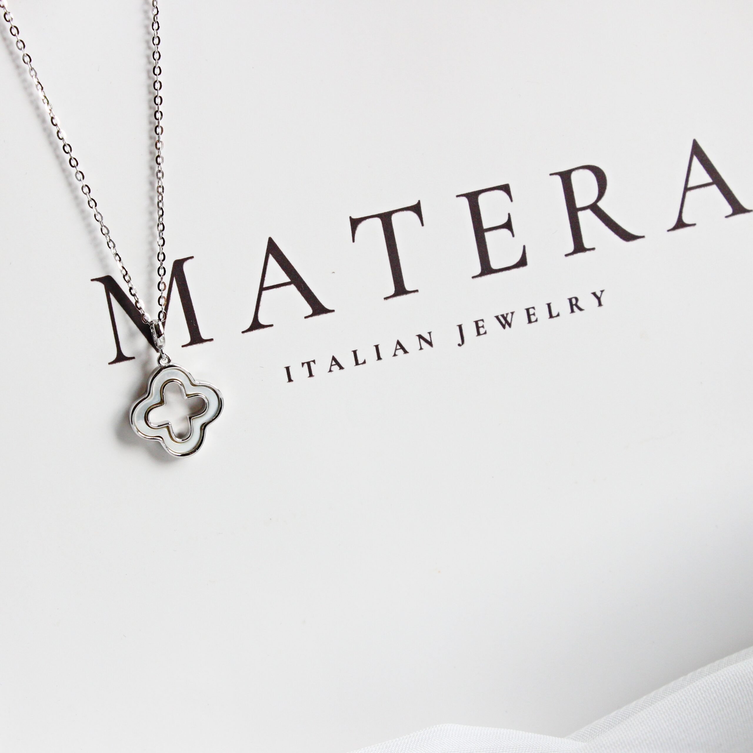 Dây chuyền mặt cỏ 4 lá rỗng Matera S925 bạc từ BST Xuân Hè 2024. Thiết kế tối giản, tinh tế với hoa bạc khảm xà cừ, bạc S925 mạ bạch kim. Tôn lên vẻ đẹp thanh lịch của nàng.